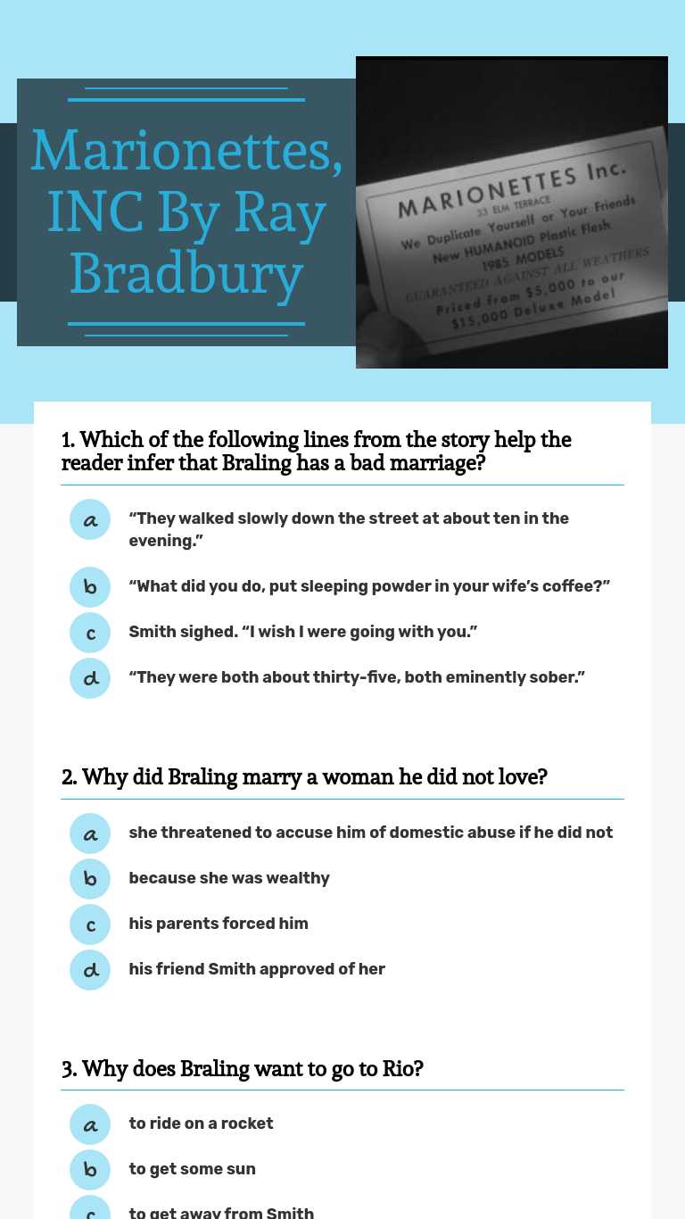 He alighted and while humming up the stairs he thought Nettie and I have fifteen thousand in our joint bank account. In the third column provide evidence from the text to support each characteristic. Marionettes inc questions These multiple choice questions over Ray Bradburys classic short story assess students comprehension of the story.