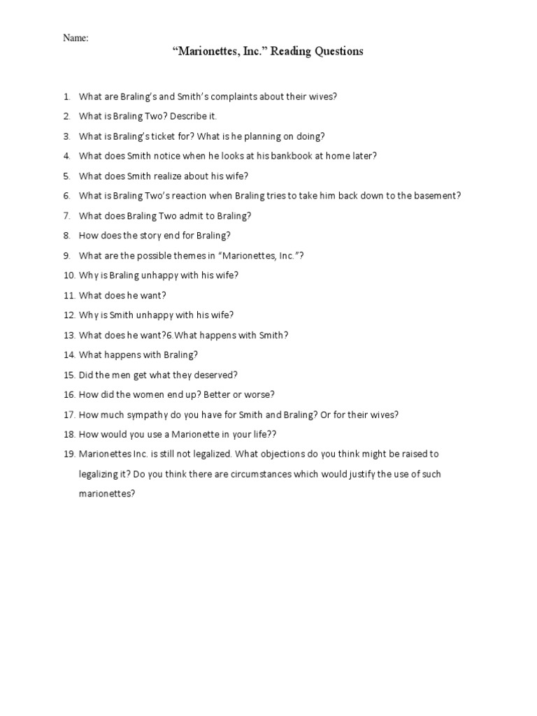 Marionettes inc worksheet answers. This is a 30-page set of worksheets for the short story Marionettes Inc by Ray Bradbury. Braling - Regrets his ten-year marriage. What did you do put sleeping powder in your wifes coffee.